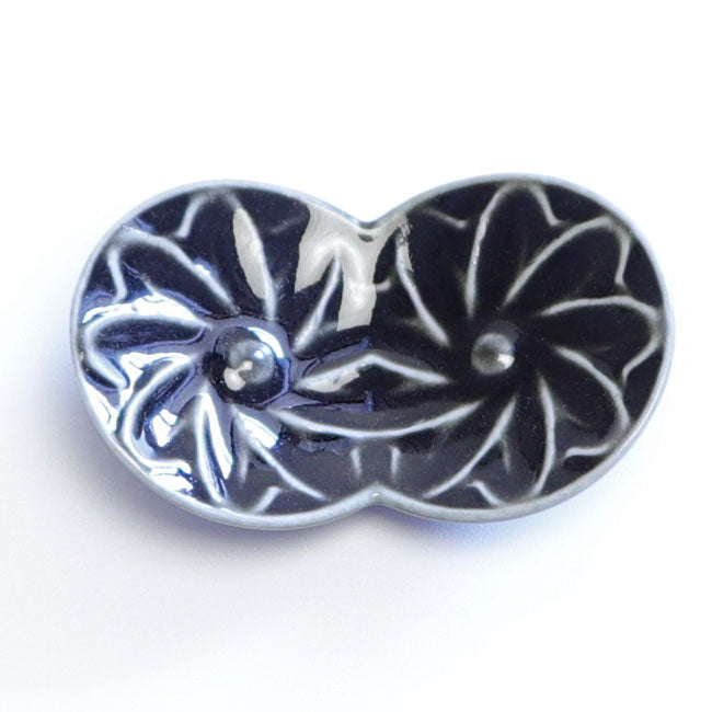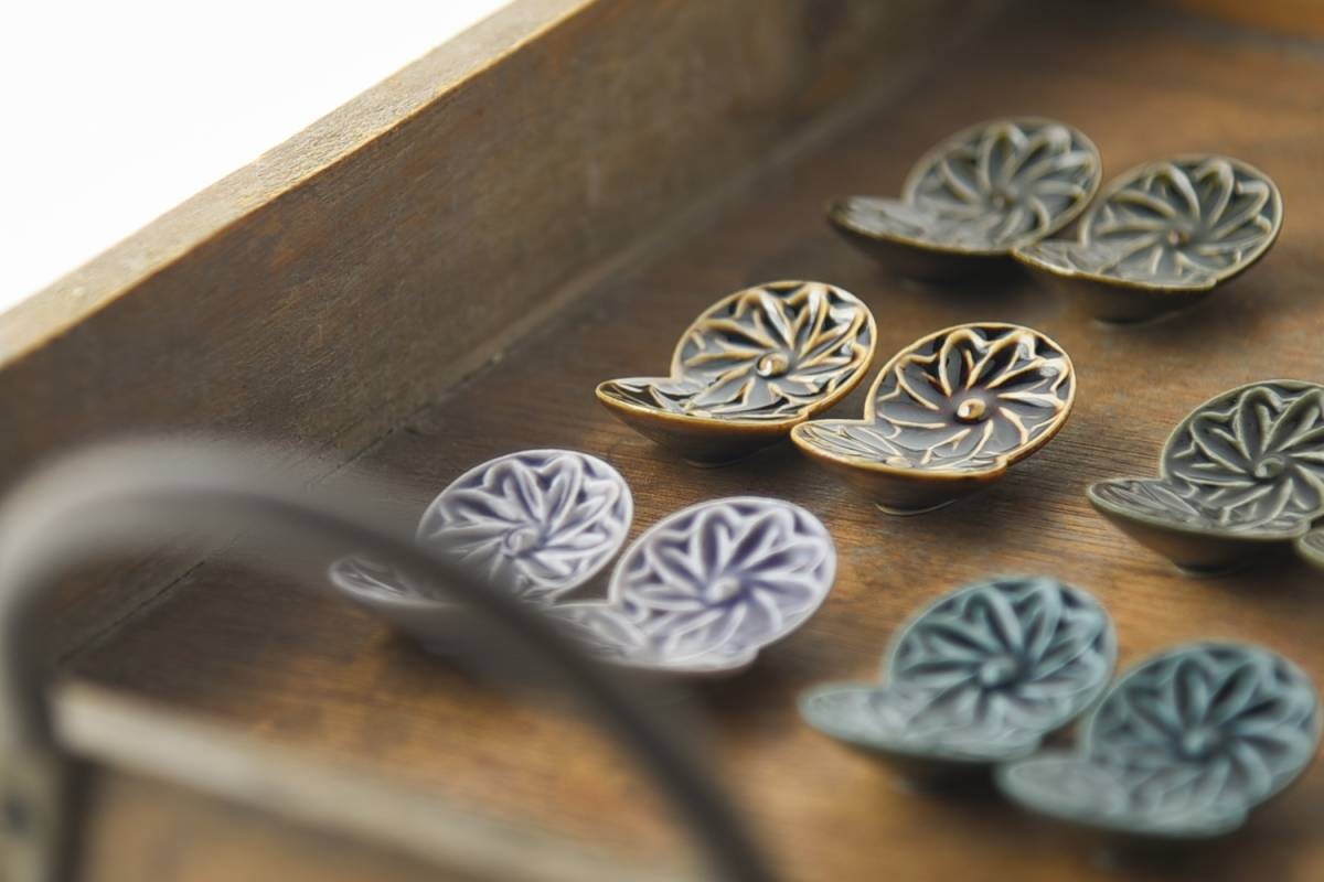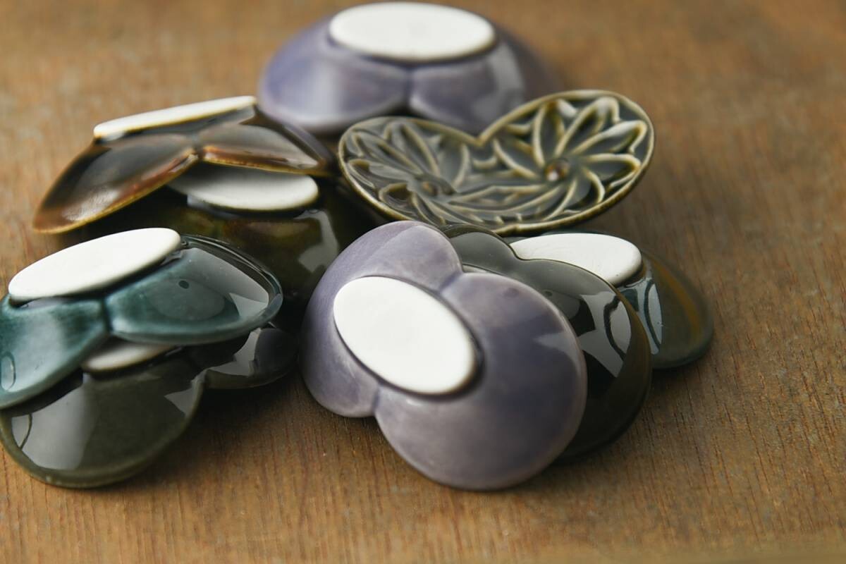 A beautifully detailed botanical motif chopstick rest crafted in Mino ware. The delicate relief pattern and deep black tone create a calm, elegant atmosphere, while also serving as a matcha scoop rest.
