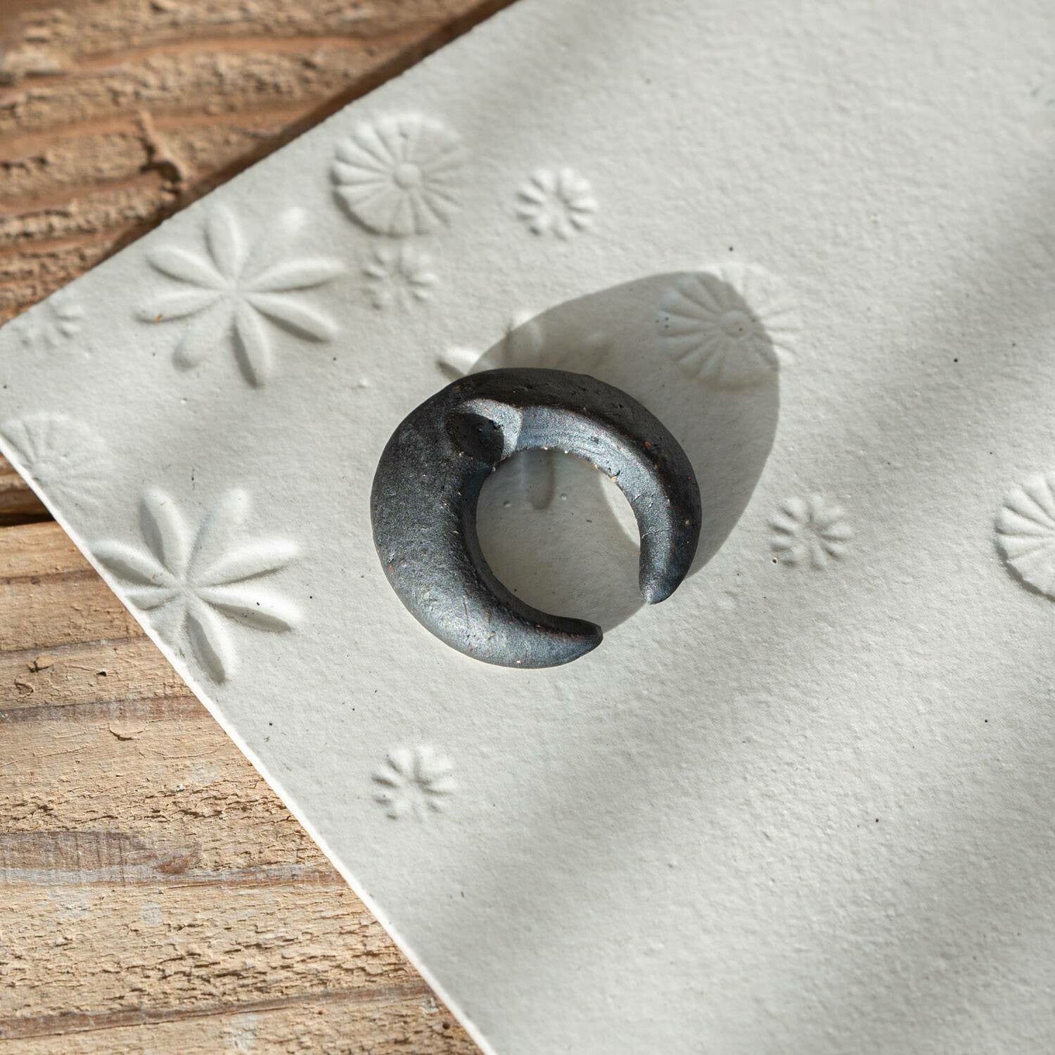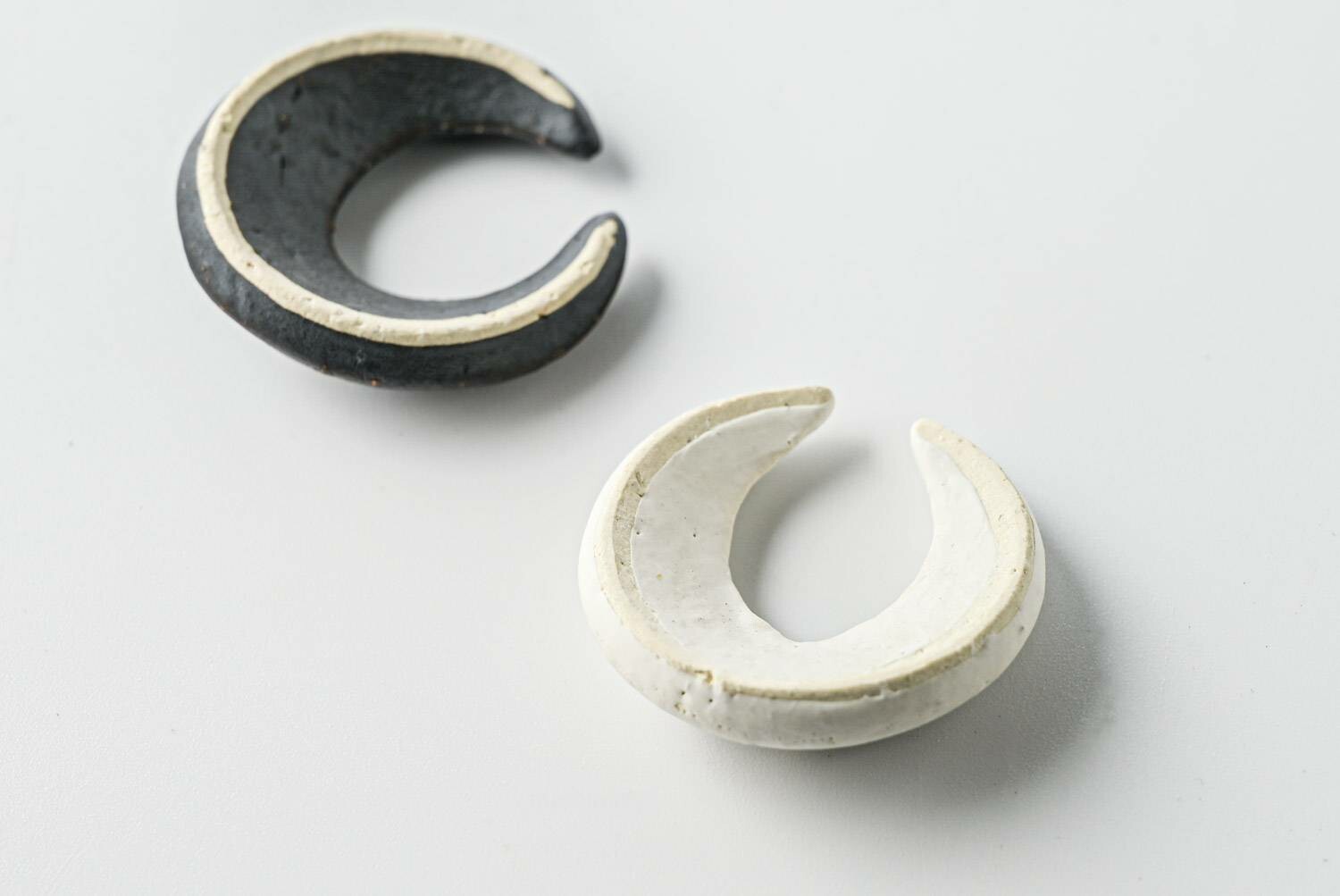 A unique moon-shaped Japanese chopstick rest crafted in Mino ware. Its deep black finish and organic texture add a refined, modern accent to your table, while also serving as a matcha scoop rest.